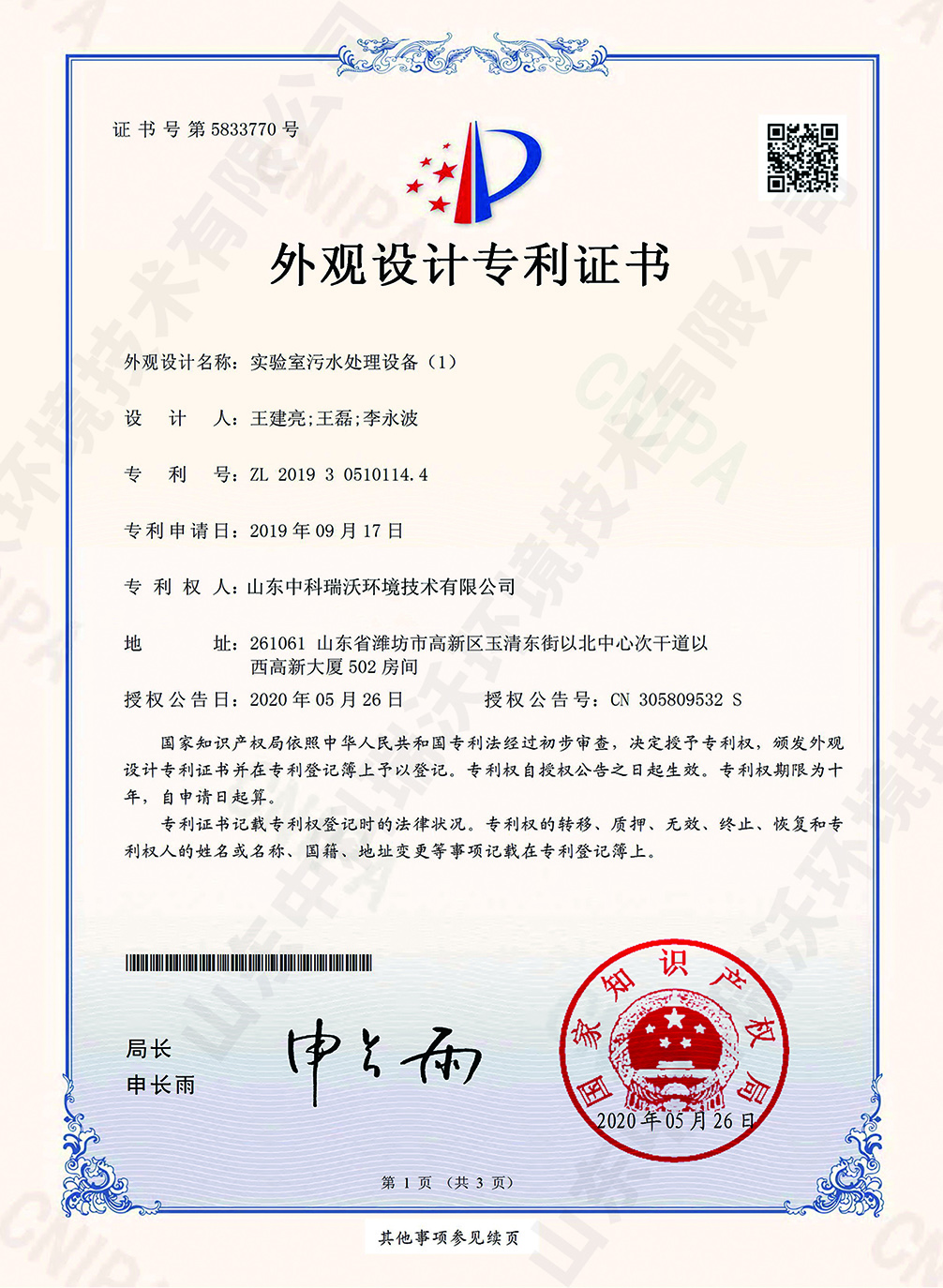 全自动中水回用设备~专利证书