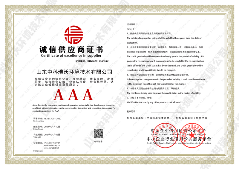 诚信供应商单位证书